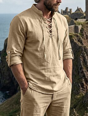 Per uomo Camicia Camicia di lino Stile vichingo Camicia Estiva Abbigliamento da spiaggia Camicia pirata Tinta unica Vacanza Casuale Nero Blu marino Azzurro cielo Verde Manica Lunga Senza colletto