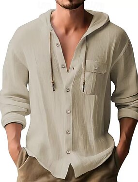 Per uomo Camicia Camicia di lino Camicia Estiva Abbigliamento da spiaggia Camicia con cappuccio Tinta unica Vacanza Ferie Nero Bianco Blu Cachi Manica Lunga Con Cappuccio Estate Primavera