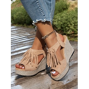 sandali con zeppa e frange da donna – tacchi a spillo boho con plateau per le vacanze estive in spiaggia, outfit casual chic e abbigliamento da festival