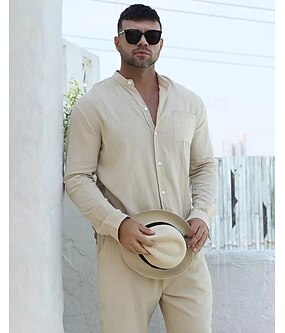 Per uomo camicia di lino 2 pezzi Completo di camicia Camicia estiva Set abbinati Camicia da spiaggia Liscio Da mare Informale Nero Bianco Blu Cachi Manica lunga A fascia Primavera estate Abbigliamento