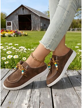 mocassini da donna color cammello con lacci con perline, scarpe comode e comode da indossare in stile casual, per giardinaggio, viaggi, weekend e comfort quotidiano