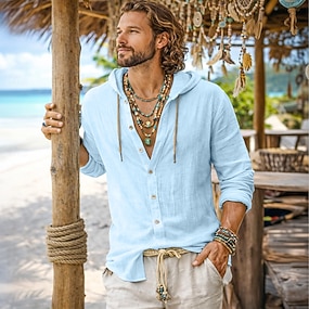 Per uomo Camicia Camicia di lino Abbigliamento da spiaggia Camicia con Bottoni Camicia con cappuccio Semplice Casuale Quotidiano Nero Bianco Cachi Verde militare Manica Lunga Con Cappuccio Estate