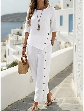 Per donna Set da due pezzi Set di Pantaloni Finto cotone e lino Mezza Manica Girocollo Semplice Moda Streetwear Casuale Quotidiano All'aperto Nero Bianco Verde Primavera & Estate Vestibilità regolare