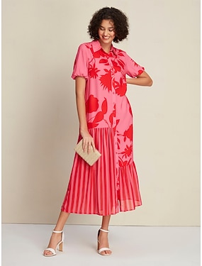 Per donna Abito Largo Abito Elegante Abito lungo maxi Rosso rosa Manica Corta Floreale A righe Stampa Orlo asimmetrico Primavera & Estate Colletto a Camicia Elegante S M L