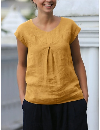 Per donna Camicia Blusa Finto cotone e lino Semplice Elegante Classico Moderno Manica Corta Scollo a V Top Regolari Quotidiano Ferie Uscire Blu Nero Bianco Rosa Marrone Estate Primavera