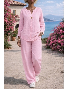 Per donna Camicia Set da due pezzi Finto cotone e lino Pantaloni di Lino Pantaloni Set Manica Lunga Scollo a V Tinta unica Coulisse Moda Streetwear Abbigliamento quotidiano Data Blu Nero Bianco