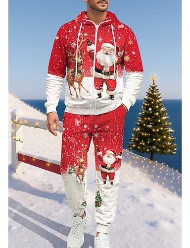 Natale Per uomo Felpa con cappuccio Tuta da Ginnastica Tuta da 2 pezzi Coulisse Con zip Blocco di colori Completo Abbigliamento Autunno Rosso Casuale Lavoro All'aperto Leggero Di tendenza Manica Lunga