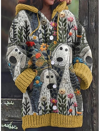 Per donna Felpa Cardigan Casual Morbido Grafico Geometrico Blocco di colori A Coste Con Cappuccio Tasca Bottoni Lavorato a maglia Manica Lunga Top lunghi Maglia All'aperto Quotidiano Weekend Giallo