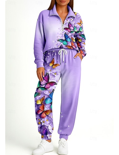 Per donna Maglia Tuta da Ginnastica Tuta da 2 pezzi Coulisse Con zip Floreale Completo Abbigliamento Autunno Viola Lavoro All'aperto Viaggio Leggero Di tendenza Manica Lunga Sport Abbigliamento