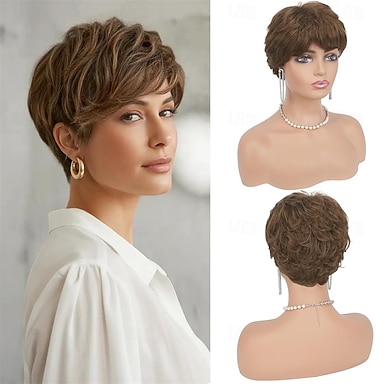Parrucche pixie castane da donna - taglio corto naturale a strati, parrucca sintetica resistente al calore per travestimenti quotidiani