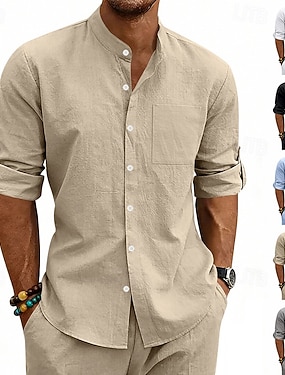 Per uomo Camicia camicia di lino Camicia con colletto a fascia Camicia estiva Abbigliamento mare Camicia con bottoni Liscio Informale Giornaliero Nero Bianco Blu Manica lunga A fascia Primavera estate