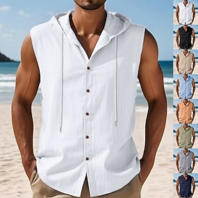 Per uomo Camicia Camicia di lino Camicia Estiva Abbigliamento da spiaggia Camicia con cappuccio Maglietta senza maniche Tinta unica Vacanza Streetwear Nero Bianco Blu marino Azzurro cielo Senza