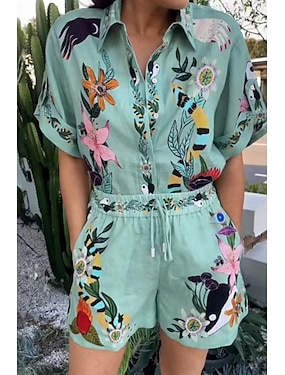 Per donna Attivo Essenziale Camicia Set ispirati al lino Set da due pezzi Manica Corta Colletto a Camicia Floreale Stampato Ferie Casual Quotidiano Weekend Verde Estate Vestibilità regolare