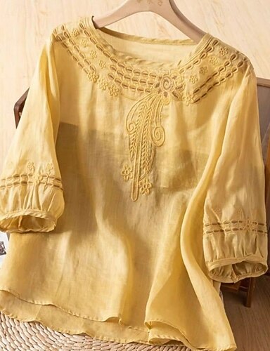 Per donna Maglietta bohémien Maglietta in cotone e lino T-shirt ricamata Bohemien Vintage Etnico Manica 3/4 Manica a Palloncino Girocollo Top Regolari Quotidiano Uscire Giallo Blu marino Albicocca