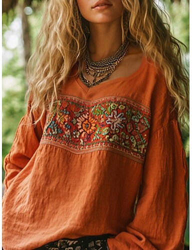 camicetta da donna in stile western, boho, camicetta in finto cotone e lino, a fiori, moderna, casual, manica lunga, scollo a V, top normali, per tutti i giorni, per le vacanze, per uscire, stampa, nero, fucsia, arancione, albicocca, grigio, estate, autun