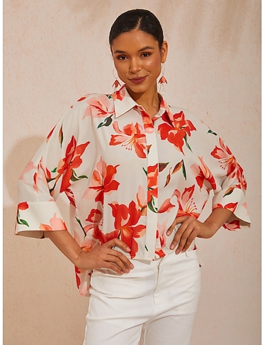 Per donna Chiffon Floreale Casuale Casual Quotidiano Manica a Pipistrello Rosso Orlo irregolare più alto basso Manica 3/4 Casual Quotidiano Colletto a Camicia Estate Primavera Primavera & Autunno