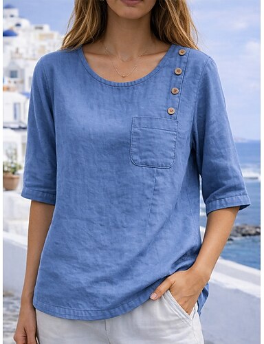 Per donna Blusa Camicia in finto lino Tasca Bottoni Semplice Essenziale Casual Mezza Manica Girocollo Top Regolari Quotidiano Blu Rosso Verde Grigio Estate Primavera