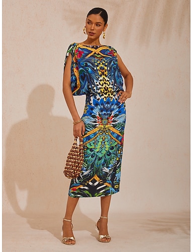 Per donna Abito Midi Abito a Tubino Elegante Quotidiano Ospite di nozze Vestibilità regolare Floreale Grafico Manica Corta Girocollo Blu marino