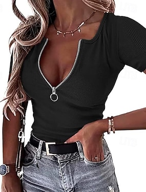 Per donna Maglietta Cerniera Tinta unica Grafico Semplice Casual Manica Corta Scollo a V Top Regolari Quotidiano Uscire Weekend Nero Vino Rosso Grigio Estate Primavera