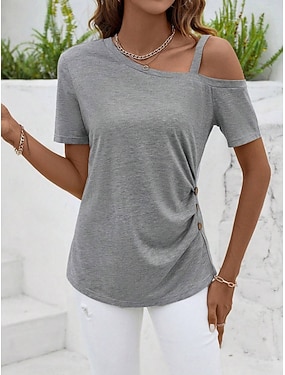 Per donna Maglietta Arricciato Tunica Bottone laterale Tinta unica Elegante Manica Corta Top con spalle scoperte Top Regolari Quotidiano Uscire Grigio Estate Primavera