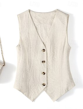 Per donna Misto lino Gilet di lino Bottoni Semplice Attivo Moderno Senza Maniche Scollo a V Top Regolari Quotidiano Uscire Nero Beige Estate