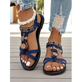 Sandali bassi da donna blu navy con perline e motivi floreali boho, comodi sandali estivi con cinturino a T di ispirazione vintage per uscite casual, vacanze al mare e uso quotidiano