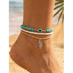 Cavigliera da donna bohémien a doppio strato, in lega &Cavigliera con ciondolo a forma di tartaruga marina, cavalluccio marino e stella marina, realizzata con perline di resina e disponibile in