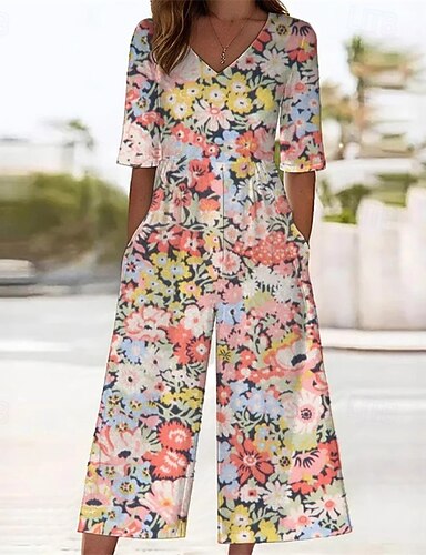 Per donna Normale Tuta Streetwear Floreale Manica Corta Gamba larga Scollo a V Tasca Stampato Streetwear Quotidiano Vestibilità regolare Rosa Estate