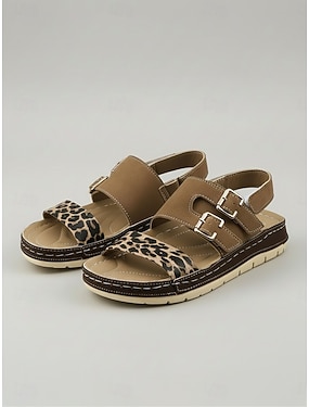 Sandali piatti comodi da donna con stampa leopardata, sandali casual imbottiti con doppio cinturino e fibbia, scarpe estive comode a punta aperta per camminare e per l'uso quotidiano. & viaggio