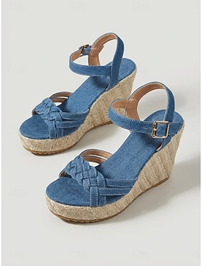 Sandali con zeppa in denim blu da donna - espadrillas casual con cinturini intrecciati e plateau con fibbia alla caviglia, ideali per crociere di lusso e resort tropicali. &eventi estivi sul terrazzo