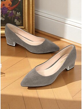 Décolleté da donna in finta pelle scamosciata grigia con tacco a blocco e punta affusolata, tacchi bassi per lavoro d'ufficio, conferenze e viaggi di lavoro