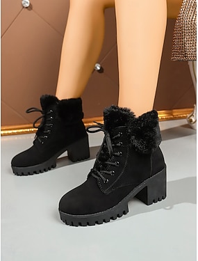stivaletti da donna neri con lacci e fodera in pelliccia – stivaletti invernali con tacco spesso e suola a carrarmato per il freddo, abbigliamento casual e all'aperto