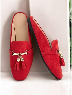 eleganti muli da donna in finta pelle scamosciata rossa con nappe e dettaglio catena dorata per abbigliamento casual e da ufficio