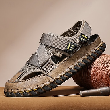 Scarpe casual da uomo in similpelle e mesh color cachi, sandali comodi con cinturino regolabile per escursioni all'aperto e abbigliamento casual quotidiano