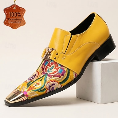 Scarpe eleganti da uomo gialle con stampa floreale, fibbia, punta affusolata e puntale in metallo, calzature formali per matrimoni, banchetti, feste, balli di fine anno, eventi di moda e occasioni serali di grande impatto.