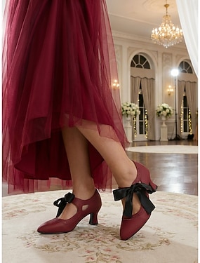 Scarpe con tacco Ribbon vintage Gatsby edwardiano - scarpe Mary Jane viola in stile 1900 con fiocco nero design a intaglio e tacco medio curvo per cosplay storici tè retro e eventi in costume