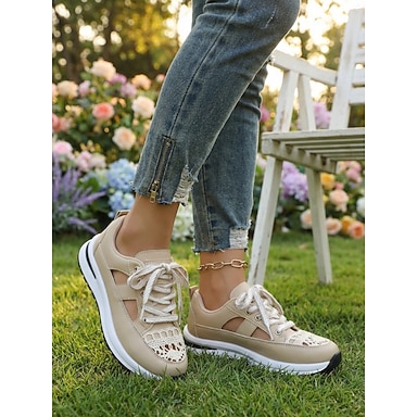 scarpe da ginnastica beige da donna con cut-out – scarpe casual traspiranti con lacci per tutti i giorni, per camminare e viaggiare