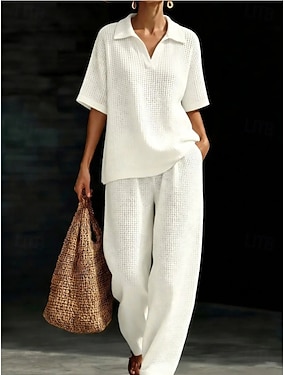 Per donna Set di Pantaloni Manica Corta Colletto a Camicia Tinta unica Moda Streetwear Casuale Quotidiano All'aperto Bianco Primavera & Estate Vestibilità comoda