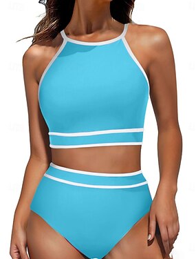 Costume da bagno bikini 2 pezzi da donna schiena scoperta abbigliamento da spiaggia per le vacanze collo halter senza maniche costumi da bagno grafiche a blocchi di colore