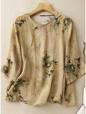 Per donna Camicie di cotone e lino Floreale Casual Manica 3/4 Girocollo Top Regolari Quotidiano Bottoni Stampato Giallo Rosa Verde Estate