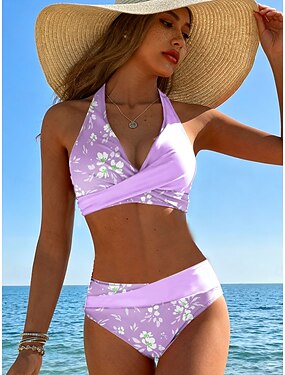 Per donna Costumi da bagno Bikini 2 pezzi Slip brasiliano Costume da bagno Schiena scoperta Taglia piccola Festività Abbigliamento mare Floreale Halter Neck Senza maniche Costumi da bagno
