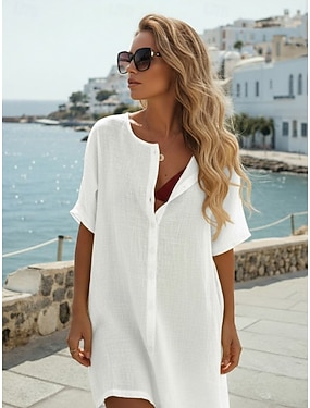 Per donna Top Lungo in Cotone Top Bianco in Cotone Blusa Bianca in Cotone Finto cotone e lino Bottoni Tinta unica Moda Scollo a V Quotidiano Streetwear Blu Bianco Rosa Rosso Fucsia Primavera & Autunno