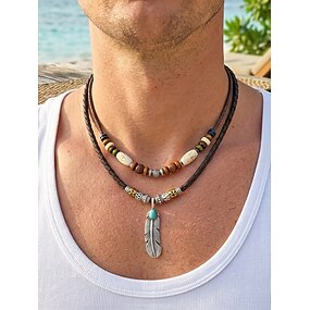Collana da uomo bohémien a doppio strato, con ciondolo a piuma e cordino cerato in lega, ideale per l'uso quotidiano, le vacanze al mare e i resort.
