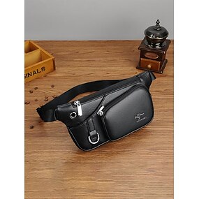 Marsupio da uomo in similpelle, nero e marrone, con scomparti multipli, ideale per il tempo libero, i viaggi, le vacanze e l'uso quotidiano all'aperto.