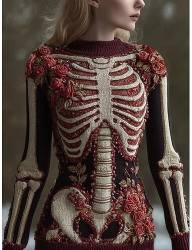 Maglione da Donna Scheletro Carino Streetwear Casual Grafica Scheletro Collo Giro Patchwork Maglina Maniche Lunghe Regular Tops Maglina Rossa Beige Autunno Inverno
