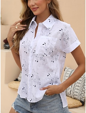 Per donna Camicia Blusa Camicia di cotone Finto cotone e lino Bottoni Floreale Elegante Classico Moderno Manica Corta Colletto a Camicia Top Regolari Quotidiano Ferie Uscire Bianco Giallo Azzurro