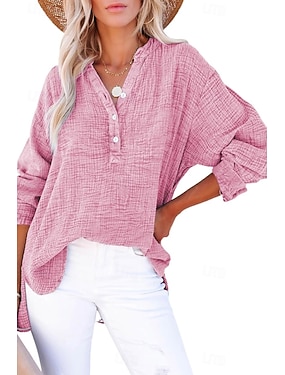 Per donna Camicia Blusa Finto cotone e lino Bottoni Semplice Essenziale Moderno Manica Lunga Scollo a V Top Regolari Quotidiano Ferie Uscire Verde chiaro Rosa Azzurro Estate