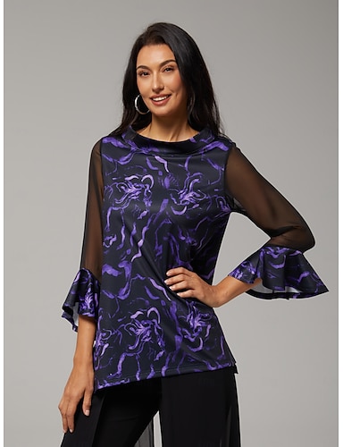 camicetta da donna con stampa floreale viola, maniche in chiffon elasticizzato, scollo a barca, casual, comoda, primavera estate autunno vacanza