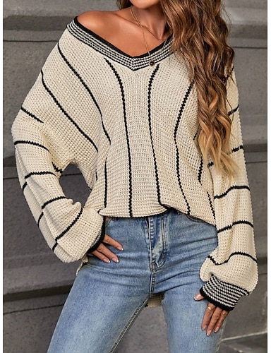 Per donna Felpa Maglione Moda Streetwear Casual A righe A Coste Scollo a V Lavorato a maglia Manica Lunga Top Regolari Maglia Quotidiano All'aperto Weekend Beige Estate Primavera