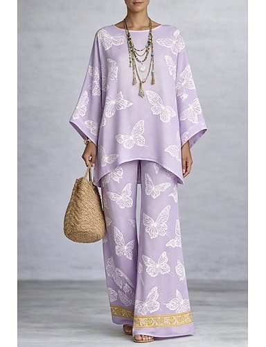 Per donna Set di Pantaloni Manica Lunga Girocollo Grafico Farfalla Stampato Moda Streetwear Casuale Quotidiano All'aperto Blu Bianco Rosa Estate Vestibilità comoda